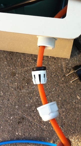 Для подключения питания компрессора, необходимо завести в моторный ящик электрокабель 220в. Для этого имеется два кабельных ввода. Один для прохода подводящего кабеля через «борт», второй- для прохода через стенку моторного ящика. Важно! Аккуратная установка кабельных вводов (особенно того, что в ящике) гарантирует, что в случае «переполнения» станции в результате сбоя в работе, вода не попадет в моторный ящик и не «убьет» дорогостоящий компрессор. Важно! Для корректной работы кабельного ввода, используемый кабель должен быть круглой формы и иметь Ф 6-12 мм. Использование плоского или овального кабеля недопустимо.