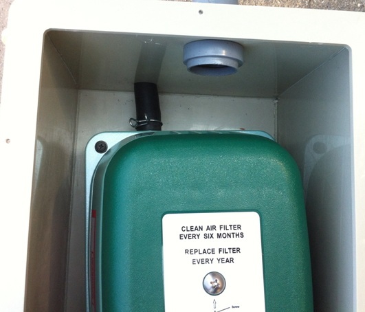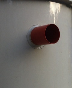 Воздухозаборник компрессорного отсека. Предназначен для присоединения трубопровода, подающего воздух в компрессорный отсек. Через него также может проходить кабель системы оповещения о некорректной работе (ставится опционально). Представляет собой раструб стандартной канализационной трубы Ф50 мм. серого цвета. Расположен в верхней части станции.