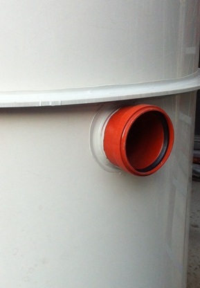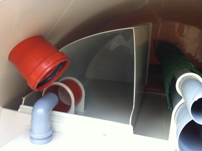 Вход. Предназначен для подсоединении канализационного трубопровода, идущего от дома. Располагается в 80 см. ниже крышки (для базовой версии). Представляет собой раструб стандартной канализационной трубы Ф110 мм.